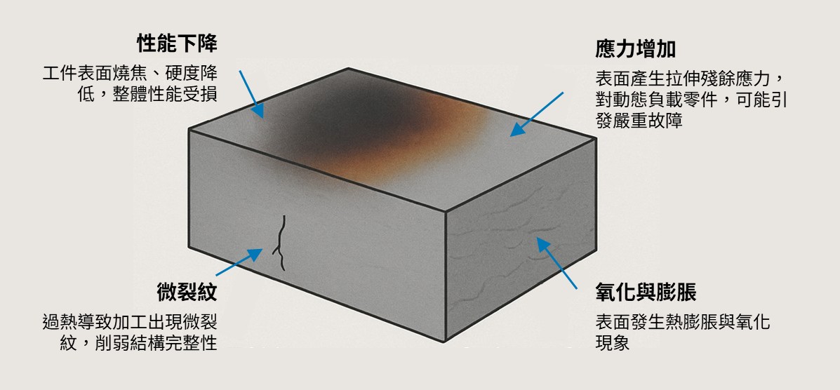 在研磨淬硬鋼時,砂輪主軸輸出的能量大部分轉化為熱能。理想狀況下,這些產生的熱量應該能夠透過切屑與冷卻液有效移除。然而,如果這些熱量未能有效散去,就會滲入工件,可能導致結構或表面性質的改變,這種現象被稱為研磨燒傷或熱損傷。這些改變可能會引發裂縫並產生拉應力。一旦被檢測出,這些問題將迫使受影響的零件報廢,以避免不良零件在關鍵應用(例如引擎、渦輪與機械設備)中造成嚴重風險。