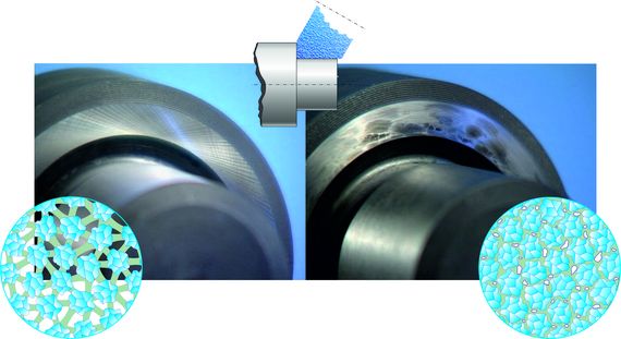 結構封閉的砂輪孔隙有限,冷卻液僅能少量到達研磨區。在這種情況下,建議諮詢砂輪供應商。對於深切研磨(creep-feed grinding),必須使用高度多孔、軟性且低結合劑含量的砂輪,以避免研磨燒傷。